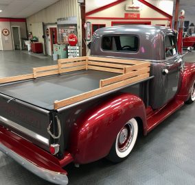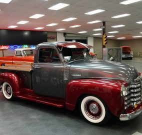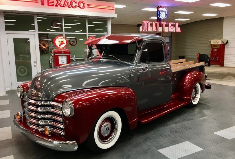 1952 Chevrolet 3100 Pick Up, a complete frame-off restoration with striking two-tone Burgundy Wine and Metallic Gray paint. Powered by a smooth 350 V8 with 700R4 overdrive transmission and upgraded Mustang II IFS, it features power steering, power disc brakes, vintage A/C, and a crisp, all-new interior—ready for both show and effortless cruising.